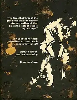 | Larry Harvey and Jerry James burn a wooden effigy of a man at Baker Beach on the summer solstice, following a tradition begun by Mary Grauberger of burning art at Baker Beach on the summer solstice.[74] | ||||||||