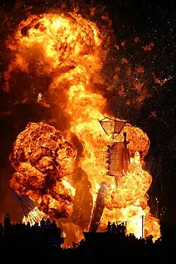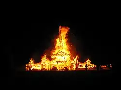 | Whereas the previous year's effigy was assembled from scrap wood on the morning of the solstice, the 1987 Man was built over several weeks from cut lumber.[75] | ||||||||