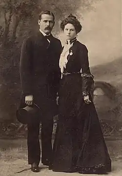 In early 1894, Cassidy became involved romantically with rancher and outlaw Ann Bassett. Her father was a rancher who did business with Cassidy, supplying him with fresh horses and beef. That same year, Cassidy was arrested at Lander, Wyoming, for stealing horses and possibly for running a protection racket among the local ranchers there. He was imprisoned in the Wyoming State Prison in Laramie, where he served eighteen months of a two-year sentence; he was released and pardoned in January 1896 by Governor William Alford Richards.[14] He became involved briefly with Bassett's older sister Josie before returning to Ann.