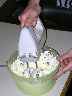 Churning produces small butter grains floating in the water-based portion of the cream. This watery liquid is called buttermilk, although the buttermilk most commonly sold today is instead directly fermented skimmed milk.[16] The buttermilk is drained off; sometimes more buttermilk is removed by rinsing the grains with water. Then the grains are "worked": pressed and kneaded together. When prepared manually, this is done using wooden boards called scotch hands. This consolidates the butter into a solid mass and breaks up embedded pockets of buttermilk or water into tiny droplets.