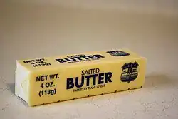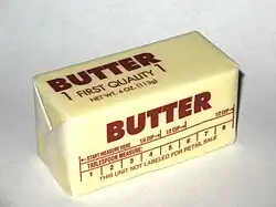 In the United States, butter has traditionally been made into small, rectangular blocks by means of a pair of wooden butter paddles. It is usually produced in four-ounce (1⁄4 lb; 110 g) sticks that are individually wrapped in waxed or foiled paper, sold in one-pound (0.45 kg) packages of four sticks. This practice is believed to have originated in 1907, when Swift and Company began packaging butter in this manner for mass distribution.[67] Due to historical differences in butter printers (machines that cut and package butter),[68] four-ounce sticks are commonly produced in two different shapes:
