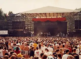 In the 1980s, Butthole Surfers earned a reputation for their disturbing live performances that were both decadent and violent. As a result, they began to attract a wide range of curiosity seekers within a few years of their debut, in addition to traditional fans of punk rock who had supported them from the beginning.[72] A staged reproduction of the band's live show was filmed for 1988's Bar-B-Que Movie, a short Super 8 mm film movie directed by Tom Stern and Alex Winter, who is best known as "Bill S. Preston, Esq." from Bill & Ted's Excellent Adventure.[73] Bar-B-Que Movie is a spoof of 1974's The Texas Chain Saw Massacre, and the film ends with a music video-style performance of the song "Fast" (a.k.a. "Fart Song"), featuring Haynes, Leary, Coffey, Nervosa, and Jeff Pinkus, as well as dancer Kathleen Lynch. The track displayed many of the band's stage gimmicks, such as the burning cymbal, strobe lights, films, and smoke.[74]