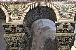 The column in San Vitale, Ravenna (547) shows above it the dosseret required to carry the arch, the springing of which was much wider than the abacus of the column. On eastern columns the eagle, the lion and the lamb are occasionally carved, but treated conventionally.
