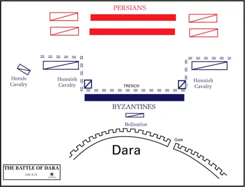 The size of Justinian's army is unclear. Bury, writing in the 1920s, accepted the estimate of 150,000 troops of all classes in 559 given by Agathia of Myrina in his History.[11] Norwich also estimated the army under Justinian at 150,000 soldiers.[12] Other scholars estimate the total strength of the imperial army under Justinian to be between 300,000 and 350,000 soldiers.[13] Field armies generally had 15,000 to 25,000 soldiers and were formed mainly of comitatenses and foederati, reinforced by the commanders' retinues and barbarian allies. The expeditionary force of Belisarius during his reconquest of Carthage from the Vandals in 533 is illustrative.