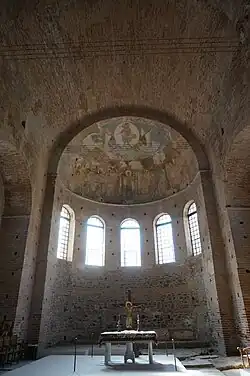 Major churches dating to this period include Hagia Eirene in Constantinople, which was rebuilt in the 760s following its destruction by the 740 earthquake. The interior of Hagia Eirene, which is dominated by a large mosaic cross in the apse, is one of the best-preserved examples of iconoclastic church decoration.[59] The church of Hagia Sophia in Thessaloniki was also rebuilt in the late 8th century.[60]