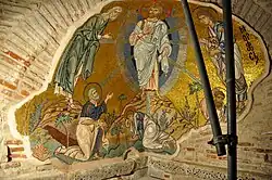 The most significant surviving monumental projects of this period were undertaken outside of the imperial capital. The church of Hagios Demetrios in Thessaloniki was rebuilt after a fire in the mid-seventh century. The new sections include mosaics executed in a remarkably abstract style.[46] The church of the Koimesis in Nicaea (present-day Iznik), destroyed in the early 20th century but documented through photographs, demonstrates the simultaneous survival of a more classical style of church decoration.[47] The churches of Rome, still a Byzantine territory in this period, also include important surviving decorative programs, especially Santa Maria Antiqua, Sant'Agnese fuori le mura, and the Chapel of San Venanzio in San Giovanni in Laterano.[48] Byzantine mosaicists probably also contributed to the decoration of the early Umayyad monuments, including the Dome of the Rock in Jerusalem and the Great Mosque of Damascus.[49]
