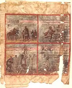 A number of important illuminated manuscripts, both sacred and secular, survive from this early period. Classical authors, including Virgil (represented by the Vergilius Vaticanus[23] and the Vergilius Romanus)[24] and Homer (represented by the Ambrosian Iliad), were illustrated with narrative paintings. Illuminated biblical manuscripts of this period survive only in fragments: for example, the Quedlinburg Itala fragment is a small portion of what must have been a lavishly illustrated copy of 1 Kings.[25]