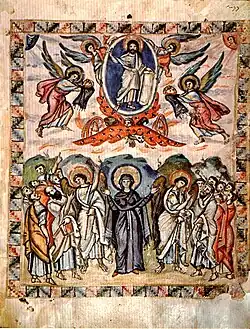 Important works of luxury art from this period include the silver David Plates, produced during the reign of Emperor Heraclius, and depicting scenes from the life of the Hebrew king David.[50] The most notable surviving manuscripts are Syriac gospel books, such as the so-called Syriac Bible of Paris.[51] However, the London Canon Tables bear witness to the continuing production of lavish gospel books in Greek.[52]