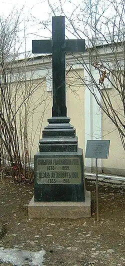 In 1916, Cui went blind, although he was still able to compose small pieces by means of dictation.[31] He died on 26 March 1918 from cerebral apoplexy and was buried next to his wife Mal'vina (who had died in 1899) at the Smolensky Lutheran Cemetery in Petrograd (now Saint Petersburg). In 1939, his body was reinterred in Tikhvin Cemetery at the Alexander Nevsky Monastery, to lie beside the other members of The Five.[32]