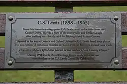 Lewis occasionally expressed a somewhat tongue-in-cheek chauvinism towards the English. Describing an encounter with a fellow Irishman, he wrote: "Like all Irish people who meet in England, we ended by criticisms on the invincible flippancy and dullness of the Anglo-Saxon race. After all, there is no doubt, ami, that the Irish are the only people: with all their faults, I would not gladly live or die among another folk."[25] Throughout his life he sought out the company of other Irish people living in England[26] and visited Northern Ireland regularly. In 1958 he spent his honeymoon there at the Old Inn, Crawfordsburn,[27] which he called "my Irish life".[28]