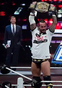 On the October 27 episode of Raw, Punk and Kofi Kingston defeated Cody Rhodes and Ted DiBiase to win the World Tag Team Championship.[96] The duo were members of Team Batista on November 23 at Survivor Series, where their team lost to Team Orton after Rhodes eliminated Punk.[97] Punk then entered a number one contender Intercontinental Championship tournament, defeating Snitsky and John Morrison in the first two rounds.[98] Punk and Kingston lost the World Tag Team Championship to John Morrison and The Miz on December 13 at a live event.[99] The next day at Armageddon on December 14, Punk defeated Rey Mysterio in the tournament finals.[98] On the January 5, 2009, episode of Raw, Punk received his title match against William Regal, which ended in a disqualification when Regal grabbed the referee's jersey.[100] Due to this, Stephanie McMahon awarded Punk a rematch the following week on Raw, but this time Punk got disqualified.[101] McMahon awarded him another rematch, a no disqualification match on the January 19 episode of Raw, where Punk defeated Regal to win the Intercontinental Championship.[102] With this win, Punk became the 19th WWE Triple Crown Champion and the fastest ever to accomplish the feat, surpassing Kevin Nash's old record of 203 days.[103][104] Punk lost the Intercontinental Championship on the March 9 episode of Raw to John "Bradshaw" Layfield (JBL).[105] On April 5 at WrestleMania 25, Punk won the Money in the Bank ladder match and became the first person to win the match twice.[106] On April 13 during the 2009 WWE draft, Punk was drafted to the SmackDown brand.[107] In the period after the draft, Punk feuded with Umaga over Umaga's repeated surprise attacks while Punk was attempting to cash in his Money in the Bank contract, ultimately resulting in a Samoan strap match at Extreme Rules on June 7, which was won by Punk.[108]