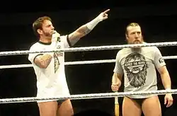 Upon being signed by World Wrestling Entertainment (WWE), CM Punk was assigned to its developmental territory, Ohio Valley Wrestling (OVW), where he was mentored by Paul Heyman.[47] He debuted in September 2005 in a dark match.[48] In his first appearance on OVW TV later that month, Punk suffered a broken nose and ruptured eardrum in a match with Danny Inferno.[49][50] In November 2005, Punk defeated Ken Doane to win the OVW Television Championship.[49] Immediately thereafter, Punk began to feud with Brent Albright, culminating in a three way dance between Punk, Doane, and Albright in January 2006; after Doane was injured during the match, he was replaced by Aaron "The Idol" Stevens, who won the match and became the new OVW Television Champion.[51] In February 2006, Punk entered into a tournament to crown a new OVW Heavyweight Champion, losing to Albright in the finals.[24] In May 2006, Punk defeated Albright in a strap match to win the OVW Heavyweight Championship.[52] In July 2006, Punk and Seth Skyfire defeated Shad Gaspard and the Neighborhoodie to win the OVW Southern Tag Team Championship, making Punk a double champion.[53] They lost the titles to Deuce Shade and "Domino" Cliff Compton in August 2006.[51] Later that same month, Punk lost the OVW Heavyweight Championship to Chet the Jett.[51] Following his defeat, Punk ceased appearing regularly with OVW, but continued to make sporadic appearances until WWE and OVW ended their developmental partnership on February 7, 2008.[54][55]