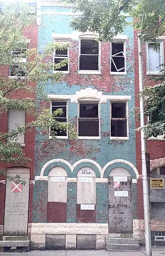 In 2019, plans were announced to demolish Calloway's boyhood home at 2216 Druid Hill Avenue in Baltimore, replacing the abandoned structure and the rest of that block with a park to be named Cab Calloway Legends Park in his honor.[78][79] Family members and the National Trust for Historic Preservation advocated preservation of the house, however, as a significant artifact of African-American cultural heritage. Although the block is designated "historically significant" on the National Register of Historic Places, Baltimore City officials said at a hearing on July 9, 2019, that there is "extensive structural damage" to the Calloway house as well as adjacent ones.[80] The Commission on Historical and Architectural Preservation's executive director, however, said that properties in worse condition than the Calloway House have been restored with financial support from a city tax credit program. Maryland Governor Larry Hogan also urged that demolition of the Calloway House be forestalled for its potential preservation as a historic house museum akin to the Louis Armstrong House in New York.[5][80] Design options for the planned Cab Calloway Square may include an archway from the facade (pictured) as part of the Square's entrance, as proposed by architects working with Baltimore City and the Druid Heights Community Development Corporation, a nonprofit community-oriented group.[81] Despite objections, the house was razed on September 5, 2020.[82]