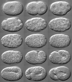 Sperm entry into the oocyte commences formation of an anterior-posterior axis.[37] The sperm microtubule organizing center directs the movement of the sperm pronucleus to the future posterior pole of the embryo, while also inciting the movement of PAR proteins, a group of cytoplasmic determination factors, to their proper respective locations.[38] As a result of the difference in PAR protein distribution, the first cell division is highly asymmetric.[39] C. elegans embryogenesis is among the best understood examples of asymmetric cell division.[40]