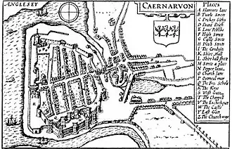 The first fortifications at Caernarfon were built by the Romans. Their fort, which they named Segontium, is on the outskirts of the modern town.[4] The fort sat near the bank of the River Seiont; the fort was probably built here due to the sheltered position and because it could be resupplied via the river Seiont.[5] Caernarfon derives its name from the Roman fortifications. In Welsh, the place was called y gaer (lenition of caer) yn Arfon, meaning 'the stronghold in the land over against Môn'; Môn is the Welsh name for Anglesey.[4] Little is known about the fate of Segontium and its associated civilian settlement after the Romans departed from Britain in the early 5th century.[5]