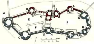 Most of the northern towers had four storeys including a basement.[45] The Eagle Tower at the western corner of the castle was the grandest. It has three turrets which were once surmounted by statues of eagles.[28] The tower contained grand lodgings, and was probably built for Sir Otton de Grandson,[45] the first justiciar of Wales.[46] A basement level contained a water gate, through which visitors travelling up the River Seiont could enter the castle.[45] Water was drawn from a well in the eponymous Well Tower.[47]