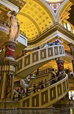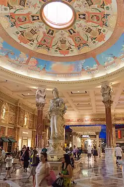 Caesars Forum is the original casino of the hotel which opened in 1966 with 30 gaming tables and 250 slot machines.[88] It contains 20 black Italian marble columns with white marble and gold leaf trimmings. Friezes and statues depict Roman conquests, and women motifs are prevalent. In the centre is a flat ornate dome with an "enormous chandelier in the shape of a Roman medallion, made of 100,000 handmade and handpolished crystals" on the ceiling.[89] It reportedly held the world record at the time for the world's largest crystal ceiling fixture.[85] The cocktail waitresses, as of 2005, still wear the same uniform which was designed by Jay Sarno: white, off-the-shoulder mini-tunics with high-heeled Roman sandals.[89]