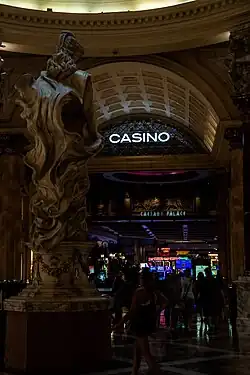 The modern casino facilities include table games such as blackjack, craps, roulette, baccarat, Spanish 21, mini-baccarat, pai gow and pai gow poker.[90] Caesars Palace's 4,500 square feet (420 m2) 24-hour poker room currently lies in heart of the gaming floor between The Colosseum and the Race & Sports Book, where racing and sports bets are put on. It moved there in June 2014, when Pure Nightclub underwent an expansion and annexed its space.[91] As of December 2015 it contains 16 tables with free Wi-Fi and USB charging ports.[92] There are many traditional reel-type slot machines, video reels machine, video poker games, video blackjack or keno, in which participants can play from 1¢ to $500.[93] One author noted that due to the combination of darkness and enclosure of the gambling room, never being lit with light from the outside, it "disorients the occupant in space and time", and one "loses track of where he is and when it is".[85]