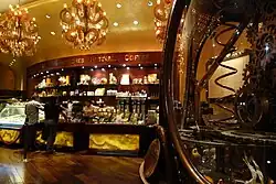 Under the direction of pastry chef and chocolatier François Payard, Payard Pâtisserie & Bistro at Caesars Palace encompasses a pastry shop, chocolate shop, and restaurant serving breakfast, lunch, and dinner.[199] The interior of the 46-seat bistro was designed by the Rockwell Group.[200] In 2008[201] the bistro installed a 16 feet (4.9 m) high "chocolate clock" that releases three chocolate truffles every quarter-hour.[202] In 1992 Wolfgang Puck was the first celebrity chef to open an upscale restaurant in a Las Vegas gambling resort with Spago at Caesars Palace.[203] Located in The Forum Shops arcade, the restaurant is divided into a cafe facing the shopping mall serving lighter, lower-cost dishes, and a more formal dining room to the rear.[203]