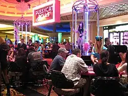 The Pussycat Dolls Lounge, an adjunct of the Pure Nightclub, opened at Caesars Palace in 2005.[146] The lounge was patterned after a vintage strip club. The club's center was a stage where dancers called the Pussycat Girls clad in fishnet hose and corsets, began a new dance show every half hour. Celebrities like Paris Hilton and Christina Aguilera occasionally danced as "guest pussycats".[147] In 2007, Caesars Palace opened a Pussycat Dolls Casino directly across from the Pussycat Dolls Lounge. It had an oval pit at the casino's center, where two go-go dancers in cages performed in response to the music.[148] At the end of February 2010, the Pussycat Dolls left the Pure nightclub for a new lounge at the Chateau nightclub, which is part of Paris Las Vegas.[149]