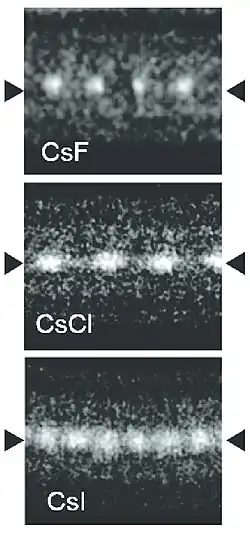 Caesium fluoride (CsF) is a hygroscopic white solid that is widely used in organofluorine chemistry as a source of fluoride anions.[39] Caesium fluoride has the halite structure, which means that the Cs+