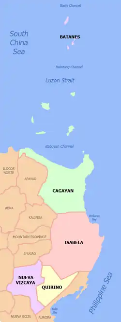Cagayan Valley (Ilocano: Tanap ti Cagayan; Filipino: Lambak ng Cagayan; Spanish: Valle del Cagayán), designated as Region II, is an administrative region in the Philippines. Located in the northeastern section of Luzon,[6] it is composed of five Philippine provinces: Batanes, Cagayan, Isabela, Nueva Vizcaya, and Quirino. The region hosts four chartered cities: Cauayan, Ilagan, Santiago, and Tuguegarao (the regional center and largest city).[7]