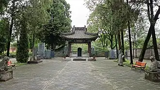 After his death in 121 CE, a shrine with his grave was built in his hometown, but was soon neglected and damaged by floods while his name was largely forgotten.[81] During the early Tang dynasty, many national heroes were deified, such as Li Bai and Guan Yu as the gods of wine and war respectively. Cai was among the important people declared gods, and was deified as the national god of papermaking.[82] Cai also became a patron saint for papermakers, with his image often being painted or printed onto paper mills and paper shops in not only China, but also Japan.[83] In 1267, a man named Chen Tsunghsi raised funds to repair the long-damaged shrine, and renovated it to include a statue of Cai and a mausoleum.[81] Chen stated that "Tsai Lung's [Cai Lun's] extraordinary talent and his achievement are exemplary to all ages."[81] A stone mortar, which legends claim Cai used to make paper, may have been brought to the mausoleum, although other sources say it was brought to the Imperial Museum in the capital of Lin'an.[84] A great ceremony was held for the new mausoleum, though it fell into ruin again and was restored in 1955.[84] Today, the temple still stands in Leiyang as the Cai Lun Temple near a pool, renamed the "Cai Lun Pool", that was thought to be near Cai's home.[85] In the Song dynasty, Fei Chu (fl. 1265[86]) said there was a temple in Chengdu where hundreds of families in the papermaking business would come to worship Cai.[87]