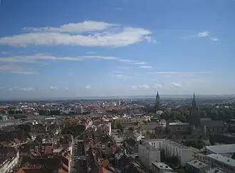 During the ensuing German occupation, it became the command post for German forces in the Pas-de-Calais/Flanders region and was very heavily fortified, as the Germans generally believed that the Allies would invade there.[70] It was also used as a launch site for V1 flying bombs and for much of the war, the Germans used the region as the site for railway guns to bombard the south-eastern corner of England. In 1943 they built massive bunkers along the coast in preparation for launching missiles on the southeast of England.[71] Despite heavy preparations for defence against an amphibious assault, the Allied invasion took place well to the west in Normandy on D-Day. Calais was very heavily bombed and shelled in a successful effort to disrupt German communications and persuade them that the Allies would target the Pas-de-Calais for invasion (rather than Normandy). The town, by then largely in ruins, was laid siege to and liberated by General Daniel Spry's 3rd Canadian Infantry Division between 25 September and 1 October 1944.[72] On 27 February 1945 Calais experienced its last bombing raid—this time by Royal Air Force bombers who mistook the town for Dunkirk, which was at that time still occupied by German forces.[73] After the war there was little rebuilding of the historic city and most buildings were modern ones.