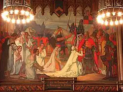 English wool trade interests and King Edward III's claims to be heir to the Kingdom of France, led to the Battle of Crécy, between England and France, in 1346,[36] followed by Edward's siege and capture of Calais, in 1347.[37] Angered, the English king demanded reprisals against the town's citizens for holding out for so long ("obstinate defence") and ordered that the town's population be killed en masse. He agreed, however, to spare them, on condition that six of the principal citizens would come to him, bareheaded and barefooted and with ropes around their necks, and give themselves up to death.[38] On their arrival, he ordered their execution, but pardoned them when his queen, Philippa of Hainault, begged him to spare their lives.[39][40] This event is commemorated in The Burghers of Calais (Les Bourgeois de Calais), one of the most famous sculptures by Auguste Rodin, erected in the city in 1895.[41] Though sparing the lives of the delegation members, King Edward drove out most of the French inhabitants, and settled the town with English. The municipal charter of Calais, previously granted by the Countess of Artois, was reconfirmed by Edward that year (1347).[42]