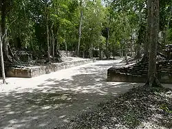 Eight sacbe (causeways) have been located around Calakmul.[75] Two of these have been mapped, three have been identified visually on the ground and three more identified with remote sensing.[6] They have been numbered as Sacbe 1 through to Sacbe 7.[6] The causeway network not only linked Calakmul with local satellite sites but also with more distant allies and rivals, such as the great cities of El Mirador, El Tintal and Nakbe.[76] Those causeways that cross swampy land are elevated above the surrounding wetland and they now tend to support denser vegetation than the surrounding forest.[77]