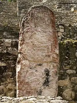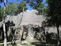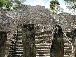 The earliest legible texts referring to the kings of the Kaan dynasty come from excavations of the large city of Dzibanche in Quintana Roo, far north of Calakmul.[28] A hieroglyphic stairway depicts bound captives, their names and the dates they were captured together with the name of king Yuknoom Che'en I, although the exact context of the king's name is unclear - the captives may have been his vassals captured by an enemy or they may have been rulers captured by the king of Calakmul. The dates are uncertain but two of them may fall within the 5th century AD.[28] The nearby Quintana Roo site of El Resbalón has a jumbled hieroglyphic text, including a date in 529, that indicates that the city was within the control of the Kaan dynasty.[31]