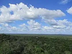Calakmul is located in Campeche state in southeastern Mexico, about 35 kilometres (22 mi) north of the border with Guatemala and 38 kilometres (24 mi) north of the ruins of El Mirador.[5] The ruins of El Tintal are 68 kilometres (42 mi) to the southwest of Calakmul and were linked to both El Mirador and Calakmul itself by causeway.[6] Calakmul was about 20 kilometres (12 mi) south of the contemporary city of Oxpemul and approximately 25 kilometres (16 mi) southwest of La Muñeca.[7] The city is located on a rise about 35 metres (115 ft) above a large seasonal swamp lying to the west,[8] known as the El Laberinto bajo (a Spanish word used in the region to denote a low-lying area of seasonal marshland).[9] This swamp measures approximately 34 by 8 kilometres (21.1 by 5.0 mi) and was an important source of water during the rainy season.[9] The bajo was linked to a sophisticated water-control system including both natural and artificial features such as gullies and canals that encircled a 22-square-kilometre (8.5 sq mi) area around the site core, an area considered as Inner Calakmul.[9] The location of Calakmul at the edge of a bajo provided two additional advantages: the fertile soils along the edge of the swamp and access to abundant flint nodules.[6] The city is situated on a promontory formed by a natural 35-metre (115 ft) high limestone dome rising above the surrounding lowlands.[6] This dome was artificially levelled by the Maya.[10] During the Preclassic and Classic periods settlement was concentrated along the edge of the El Laberinto bajo, during the Classic period structures were also built on high ground and small islands in the swamp where flint was worked.[6]