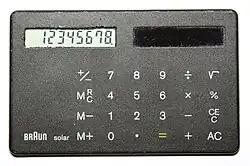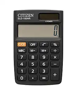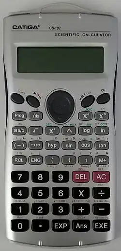Electronic calculators contain a keyboard with buttons for digits and arithmetical operations; some even contain "00" and "000" buttons to make larger or smaller numbers easier to enter.[3] Most basic calculators assign only one digit or operation on each button; however, in more specific calculators, a button can perform multi-function working with key combinations.
