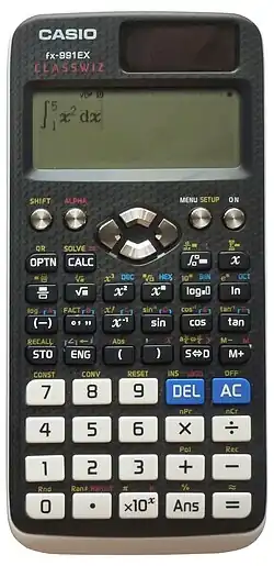 A modern scientific calculator with a dot-matrix display