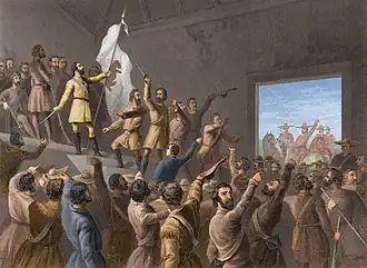 Vallejo then invited the filibusters' leaders into his home to negotiate terms. Two other Californio officers and Leese joined the negotiations. The insurgents waiting outside sent elected "captains" John Grigsby and William Ide inside to speed the proceedings. The effect of Vallejo's hospitality in the form of wine and brandy for the negotiators and someone else's barrel of aguardiente for those outside is debatable. However, when the agreement was presented to those outside they refused to endorse it. Rather than releasing the Mexican officers under parole they insisted they be held as hostages. John Grigsby refused to remain as leader of the group, stating he had been deceived by Frémont. William Ide gave an impassioned speech urging the rebels to stay in Sonoma and start a new republic.[38] Referring to the stolen horses Ide ended his oration with "Choose ye this day what you will be! We are robbers, or we must be conquerors!"[39]