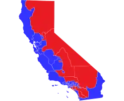 Between 1933 and 1967, state legislative districts were drawn according to the "Little Federal Model" by which Assembly seats were drawn according to population and senate seats were drawn according to county lines.[8] The guidelines were that no senate district would include more than three counties and none would include less than one complete county. This led to the situation of a populous county such as Los Angeles County (1960 population of 6 million) being accorded the same number of state senators (one) as less populous counties such as Alpine County (1960 pop. 397). The senate districts remained unaltered from 1933 to 1967, regardless of the changes in the population distribution. In Reynolds v. Sims, the United States Supreme Court compelled all states to draw up districts with equal population. As such, boundaries were changed to comply with the ruling. The California State Senate has never been expanded since the enactment of the 1879 constitution. In 1962, voters were asked via initiative California Proposition 23 whether to expand the state senate by 10 seats, thereby increasing the size of the body to 50 seats, and to abandon the little federal model.[9] This proposition was rejected by the voters 46.65% - 53.35% (2,181,758 - 2,495,440).[10]