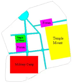 The Romans typically built a city according to a Hippodamian grid plan – a north–south arterial road, the Cardo (which is now the Suq Khan-ez-Zeit), and an east–west arterial road, the Decumanus Maximus (which is now the Via Dolorosa).[49] The forum would traditionally be located on the intersection of the two roads, with the main temples adjacent.[49] However, due to the obstruction posed by the Temple Mount, as well as the Tenth Legion encampment on the Western Hill, Hadrian's city had two Cardo, two Decumanus Maximus, two forums,[49] and several temples. The Western Forum (now the Muristan) is located on the crossroads of the West Cardo and what is now El-Bazar/David Street, with the Temple of Aphrodite adjacent, on the intersection of the Western Cardo and the Via Dolorosa. The Northern Forum is located north of the Temple Mount, on the junction of the Via Dolorosa and the Eastern Cardo (the Tyropoeon), adjacent to the Temple of Jupiter Capitolinus, intentionally built atop the Temple Mount.[50] Another popular holy site that Hadrian converted to a pagan temple was the Pool of Bethesda, possibly referenced to in the fifth chapter of the Gospel of John,[51][52] on which was built the Temple of Asclepius and Serapis. While the positioning of the Temple of Aphrodite may be, in light of the common Colonia layout, entirely unintentional, Hadrian is known to have concurrently built pagan temples on top of other holy sites in Jerusalem as part of an overall "Romanization" policy.[53][54][55][56][57]