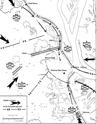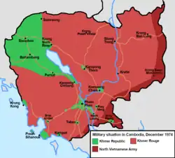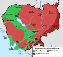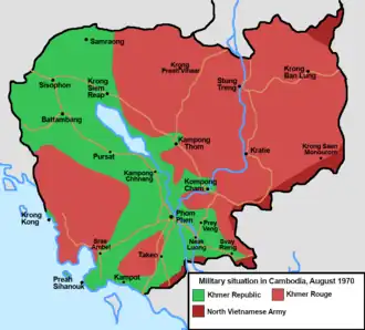 In the wake of the coup, Lon Nol did not immediately launch Cambodia into war. He appealed to the international community and to the United Nations in an attempt to gain support for the new government and condemned violations of Cambodia's neutrality "by foreign forces, whatever camp they come from."[77] His hope for continued neutralism availed him no more than it had Sihanouk. On 29 March 1970, the North Vietnamese had taken matters into their own hands and launched an offensive against the now renamed Forces Armées Nationales Khmères or FANK (Khmer National Armed Forces) with documents uncovered from the Soviet archives revealing that the offensive was launched at the explicit request of the Khmer Rouge following negotiations with Nuon Chea.[8] The North Vietnamese overran most of northeastern Cambodia by June 1970.[9]