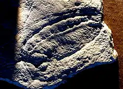 Trace fossils consist mainly of tracks and burrows, but also include coprolites (fossil feces) and marks left by feeding.[47][48] Trace fossils are particularly significant because they represent a data source that is not limited to animals with easily fossilized hard parts, and reflects organisms' behaviour. Also, many traces date from significantly earlier than the body fossils of animals that are thought to have been capable of making them.[49] While exact assignment of trace fossils to their makers is generally impossible, traces may, for example, provide the earliest physical evidence of the appearance of moderately complex animals (comparable to earthworms).[48]