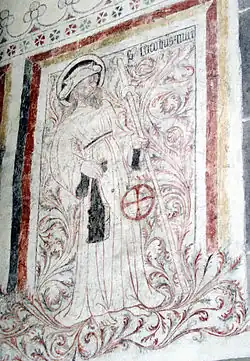 From its connection to the Camino, the scallop shell came to represent pilgrimage, both to a specific shrine as well as to heaven, recalling Hebrews 11:13, identifying that Christians "are pilgrims and strangers on the earth".[12] The scallop shell symbol is used as a waymarker on the Camino, and is commonly seen on pilgrims themselves, who are thereby identified as pilgrims. During the medieval period, the shell was more a proof of completion than a symbol worn during the pilgrimage. The pilgrim's staff is a walking stick used by some pilgrims on the way to the shrine of Santiago de Compostela in Spain.[13] Generally, the stick has a hook so that something may be hung from it; it may have a crosspiece.[14] The usual form of representation is with a hook,[15] but in some the hook is absent.[16] The pilgrim's staff is represented under different forms and is referred to using different names, e.g. a pilgrim's crutch, a crutch-staff. The crutch, perhaps, should be represented with the transverse piece on the top of the staff (like the letter "T") instead of across it.[17]