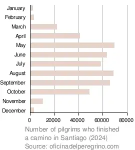 The Pilgrims Office publishes statistics regarding pilgrims who got the certificate of accomplishment. In 2024 the most popular routes were the Frances (47%), Portugues (19%), Potuguese Costa (15%), Ingles (5.6%), Primitivo (4.9%) and Norte (4.3%). Most pilgrims had a Spanish nationality (44%), followed by US-Americans (8%), Italians (6%), Germans (4.9%) and Portuguese (4.6%). Most pilgrims started in Sarria (32%), Tui/Valença (11.3%), Porto (10.5%), Saint-Jean-Pied-de-Port (6.9%) and Ferrol (5.7%). 93% do the journey on foot and 4.6% by bike. The months in which most pilgrims finish their journey in Santiago de Compostela are from May to September.[49]