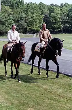 U.S. president Ronald Reagan (left) and Mexican president José López Portillo (right) riding horses in Camp David, Maryland