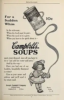 The soup is said to have reminded Warhol of his mother, Julia, who served it to him regularly while raising him during the Great Depression, as Czech immigrants in a Pennsylvania coal mine town.[104] At times, the family could not even afford to splurge on Campbell's Soup and ate soup made from ketchup.[105] It is regarded as doubtful that the Warhols had Campbell's Soup often, since it was marketed as an upscale item, and Julia was a soupmaker who could cook from scratch.[97] It wasn't until the late 1950s that canned soup was targeted toward the working class.[106]