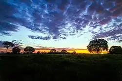 Campo Grande has a tropical savanna climate (Köppen: Aw), just slightly drier than a tropical monsoon climate, with a mild appearance of cold air masses on the southern edge of the tropics. It has semi-humid, hot summers, and notably seasonal, with a dry winter season from June through September, but without major irregularities in the precipitation.[8][9] Its altitude a few hundred meters higher than in the surrounding swamps and its location in the interior of South America, gives a much more extreme climate than several Brazilian cities, although still moderate. In addition, the flood is one of the problems seen in the city, the result of intense rains that occur in a short period.[10] Annual rainfall averages 1,465 millimetres (57.7 in). January is the warmest and rainiest month, with mean highs of 29 °C (84.2 °F) and lows of 20 °C (68.0 °F).
