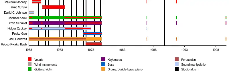 | Past members | Michael Karoli Jaki Liebezeit Irmin Schmidt Holger Czukay Malcolm Mooney Damo Suzuki David C. Johnson Rosko Gee Rebop Kwaku Baah |