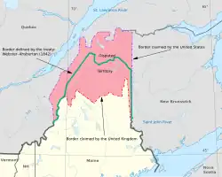 The Treaty of 1818 saw the expansion of both British North America and the United States, with their boundary extending westward along the 49th parallel, from the Northwest Angle at Lake of the Woods to the Rocky Mountains.[4] While the Laurentian Divide had previously been agreed to as a border, the flatness of the terrain made it difficult to locate this line.[5] The treaty extinguished British claims to the south of the 49th in the Red River Valley, which was part of Rupert's Land. The treaty also extinguished U.S. claims to land north of the 49th in the watershed of the Missouri River, which was part of the Louisiana Purchase. The border vista theoretically follows the 49th parallel, but in practice, the 19th-century surveyed border markers vary by several hundred feet in spots.[6]