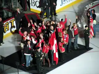 Since 1994, Canadian national hockey team players have worn uniforms that feature the logo of Hockey Canada, the governing body of the sport in Canada.[11] The International Olympic Committee (IOC) does not allow the use of national federation logos, but did not strictly enforce the rule until the 2008 Summer Olympics. Canadian hockey teams used the Hockey Canada logo at the 1998, 2002 and 2006 Winter Olympics, because the IOC does allow an exemption if the nation's National Olympic Committee approves.[12] The Canadian Olympic Committee (COC) chose not to support an exemption. Chris Rudge, the COCs chief executive officer, said "[Hockey Canada] is discontent is that we're not going the extra mile to go for an exemption for [them] ... but it's not our fight, it's the IOC's rule, and Hockey Canada knew this was coming. [...] We got directives on the summer uniforms two years ago, and we shared it then with the winter sports. We told them we didn't have the directives for winter sports at that time, but they had to know it was coming. … We let them know it would be a harder issue than before."[13] Hockey Canada executives, concerned that they would lose money through apparel sales, unsuccessfully protested the decision.[14] Bob Nicholson, president of Hockey Canada, said "The COC is supposed to lead Canada into the Olympics and hopefully this isn't the way the COC is going to lead us over the next 13 months. [...] I just wish they would support us at the IOC level and they did not do that and I don't like that type of teammate."[15] A new design was unveiled on 17 August 2009. According to Nicholson, the new jerseys will only be used in the 2010 tournament, and players will use the old version at other international tournaments.[16]