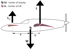 . - ^ Garrison (2002), page 85; "Because the center of gravity is not sitting right on top of the centre of lift, but is ahead of it, the aircraft would tip over forward if some balancing force were not provided. This is the function of the stabiliser."