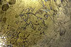 In Greek Mythology, Canis Major represented the dog Laelaps, a gift from Zeus to Europa; or sometimes the hound of Procris, Diana's nymph; or the one given by Aurora to Cephalus, so famed for its speed that Zeus elevated it to the sky.[6] It was also considered to represent one of Orion's hunting dogs,[7] pursuing Lepus the Hare or helping Orion fight Taurus the Bull; and is referred to in this way by Aratos, Homer and Hesiod. The ancient Greeks refer only to one dog, but by Roman times, Canis Minor appears as Orion's second dog. Alternative names include Canis Sequens and Canis Alter.[6] Canis Syrius was the name used in the 1521 Alfonsine tables.[6]