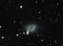 NGC 2207 and IC 2163 are a pair of face-on interacting spiral galaxies located 125 million light-years from Earth. About 40 million years ago, the two galaxies had a close encounter and are now moving farther apart; nevertheless, the smaller IC 2163 will eventually be incorporated into NGC 2207. As the interaction continues, gas and dust will be perturbed, sparking extensive star formation in both galaxies.[97] Supernovae have been observed in NGC 2207 in 1975 (type Ia SN 1975a),[98] 1999 (the type Ib SN 1999ec),[99] 2003 (type 1b supernova SN 2003H),[100] and 2013 (type II supernova SN 2013ai).[101] Located 16 million light-years distant,[94] ESO 489-056 is an irregular dwarf- and low-surface-brightness galaxy that has one of the lowest metallicities known.[102]